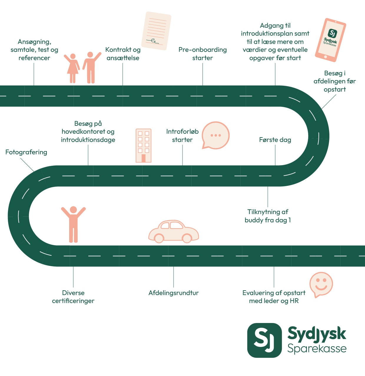 Vi har en klar og tydelig plan for det forløb, du kommer i gennem, når du starter i Sydjysk Sparekasse. Det har vi illustreret her på siden og det giver dig et overblik over, hvad du kan forvente.